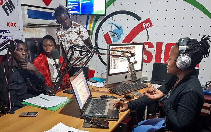 Young adults participate in a round table discussion during a USAID Tulonge Afya-supported community radio show.